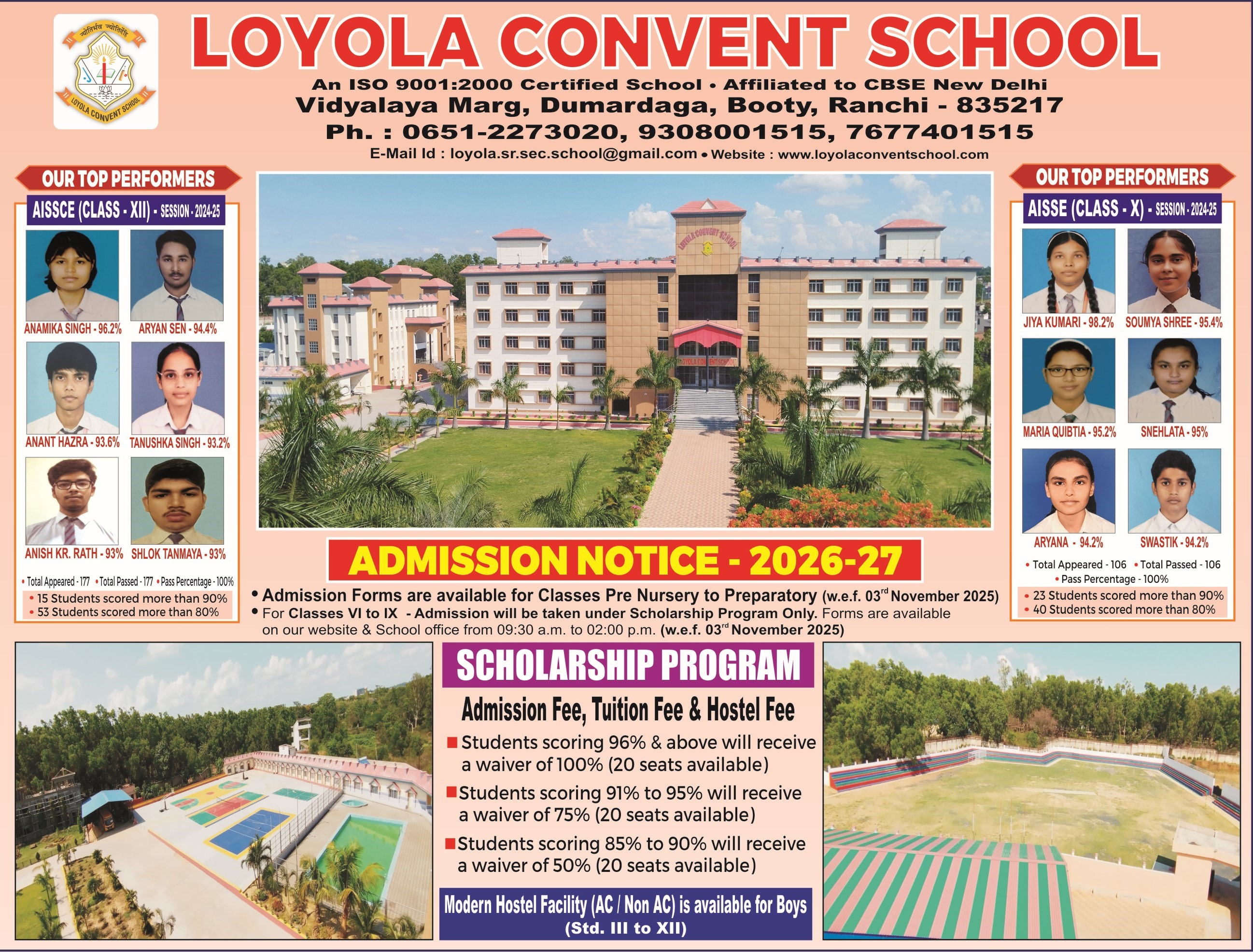Loyola Senior Sec. School, an English Medium Co-educational School was established in 1986, keeping in view the scarcity of English Medium Schools in Ranchi Town. Education in its wider sense is deeply related to integrated development of the personality of the students. Our institution, apart from academic excellence provides environment to propagate cultural, traditional, moral and spiritual values of life. Education reflects the spirit of the age. Its shapes and moulds the students according to its new ideas. Thus our school is not only confined to the educational sphere but it is a mission also to cut across the barriers of caste and smooth out inequalities imposed by birth and other circumstances. We provide moral education to cut across the barriers of class distinction social evils, and gender inequalities. Feelings of nationalism, secularism and socialism are inculcated into the students from the very beginning through various means.